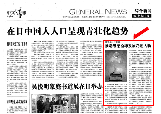 An article dated it on November 26, 2009 of weekly general Chinese newspaper / 中文導報 proud of the domestic greatest circulation published in Japan to. |