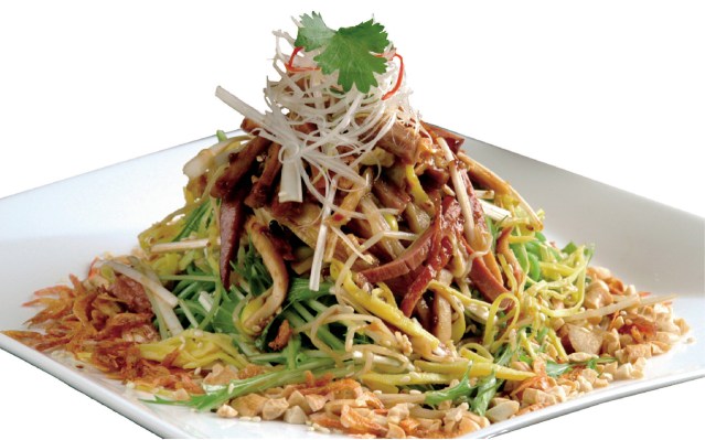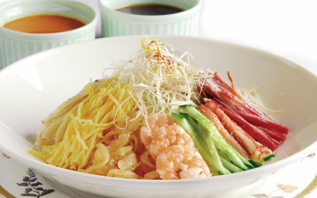 焼き鴨・窯焼きチャーシュー・茹で鶏・干し桜海老・錦糸卵・大豆もやし・水菜・ネギなどが入った聘珍樓オリジナル冷やし麺です。